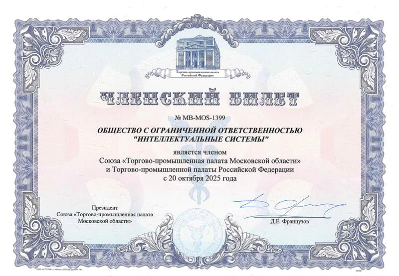 Компания ООО “Интеллектуальные системы” стала членом Торгово-промышленной палаты Московской области (ТПП МО). Решение о вступлении было принято в октябре 2025 года.